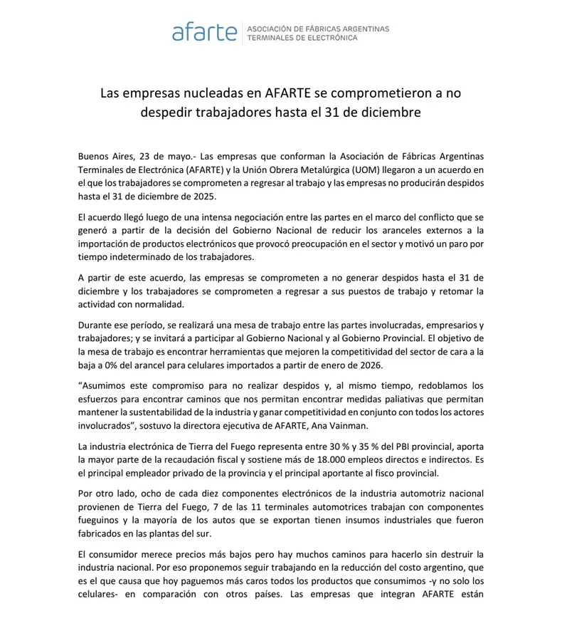 Después de una semana de paro en las plantas electrónicas de Tierra del Fuego, la Unión Obrera Metalúrgica (UOM) y la Asociación de Fábricas Argentinas Terminales de Electrónica (AFARTE) alcanzaron un acuerdo que garantiza la estabilidad laboral hasta el 31 de diciembre de 2025. El convenio, firmado este viernes, establece el compromiso de las empresas de no realizar despidos y de no descontar los días de paro a los trabajadores.